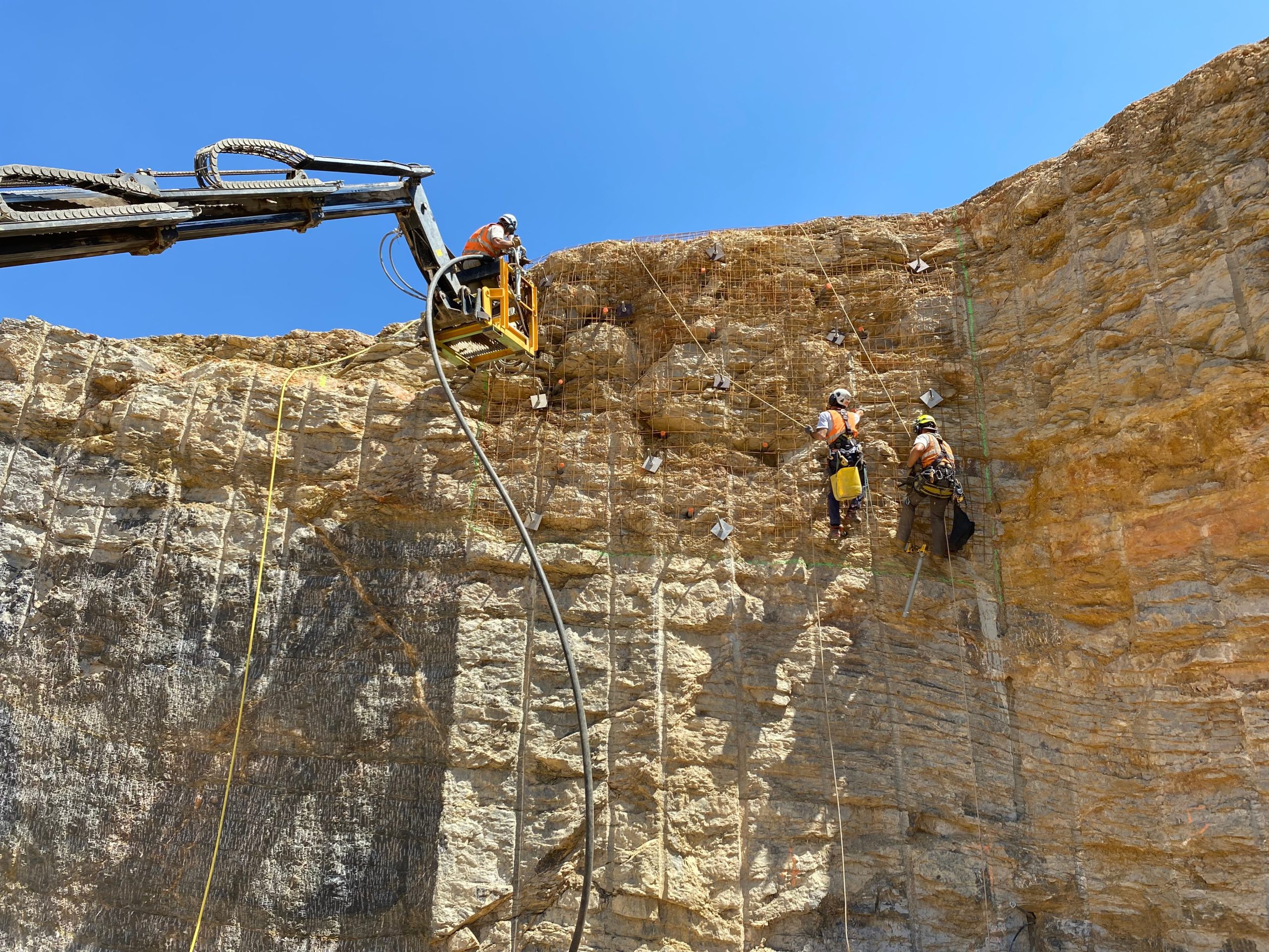 Dans le cadre d’un projet d’installation de concasseur sur le site carrière de Lafarge Port la Nouvelle, nous avons réaliser une sécurisation d’un front de taille qui accueille désormais une nouvelle branche de l’usine. Notre intervention s’est déroulée en 2 temps. Une premiere phase pour sécuriser la zone contre les chutes de blocs rocheux vis-à-vis des autres entreprises pour le montage des structues métalliques :